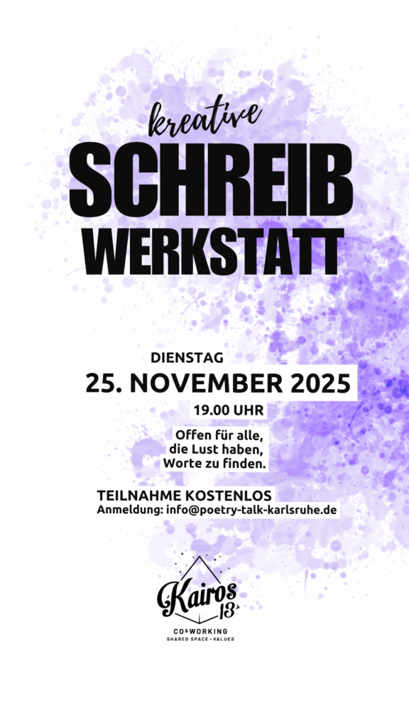 Für alle, die Lust haben, eigene Worte zu finden, selbst Texte zu schreiben und einzutauchen in spoken word, bieten wir am 25. November eine kreative Schreibwerkstatt im Kairos13 an. Die Teilnahme ist kostenlos.
